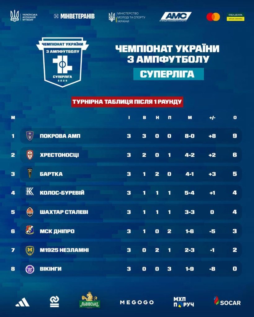 Турнірна таблиця Суперліги Чемпіонату України з ампфутболу після І раунду, який відбувся цими вихідними на Київщині.